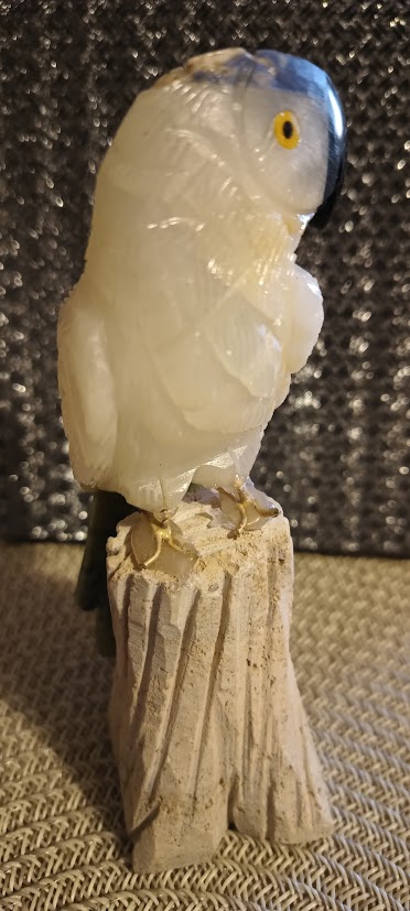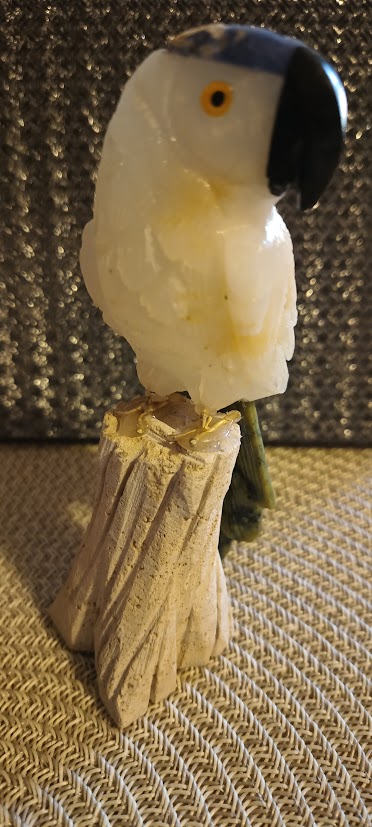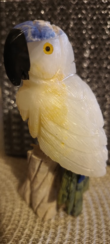 Papoušek z přírodního kamene: nos-Onyx, čepička-Sodalit, tělo-Kalcit, ocas-Serpentin, ocásek-Sodalit.
